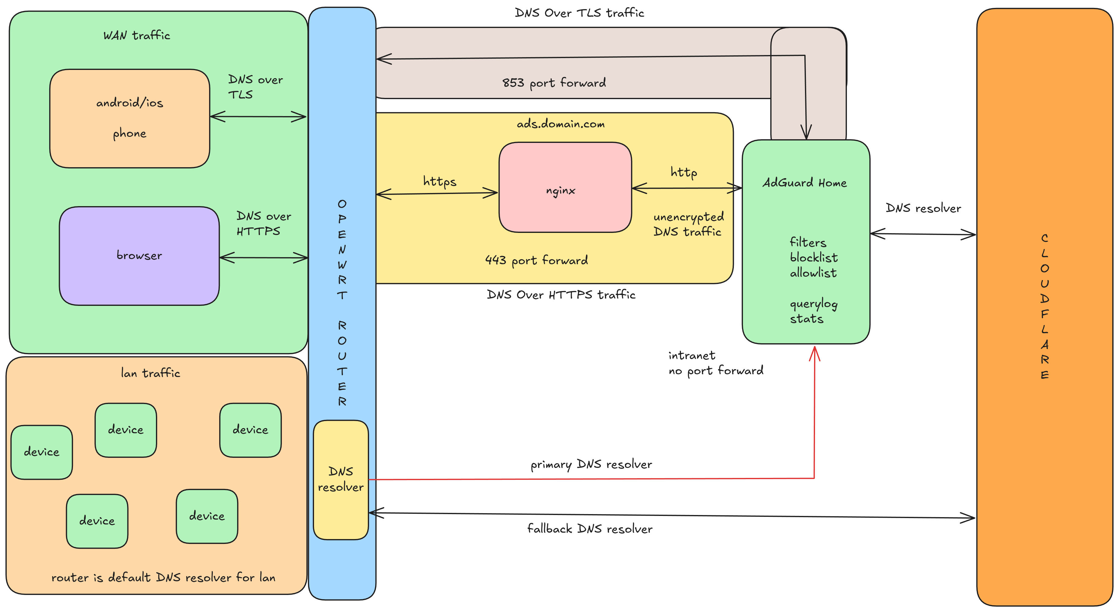 In this previous setup, my OpenWrt-based router sits at the center. For LAN devices, OpenWrt acts as the default DNS resolver via DHCP and forwards queries internally to AdGuard Home without exposing plain DNS (53) to the internet. For WAN access, the router forwards only the required encrypted ports - 443 for DoH and 853 for DoT - to the AdGuard host. This keeps DNS on port 53 confined to the trusted local network while allowing secure, encrypted DNS access from external devices.