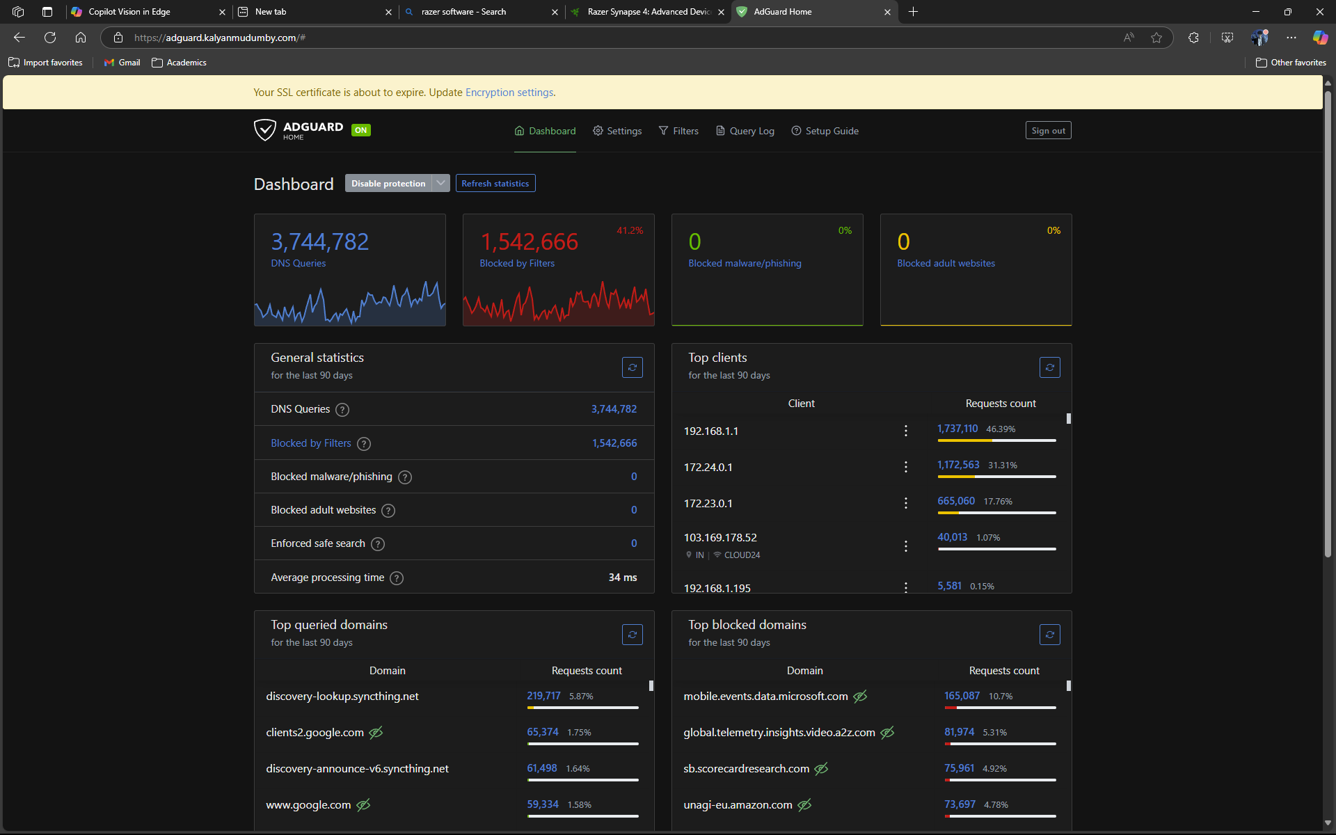Here are some stats from when I was running my AdGuard Instance in my Home Network as my primary DNS resolver and my DoH and DoT endpoint.