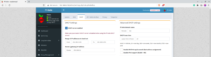 After the first step is complete, we need to make PiHole our DHCP Server. This can be done by going to Settings in the Web Interface. Navigate to the DHCP tab and check the DHCP Server enabled checkbox; click on save to save the current configuration.